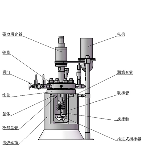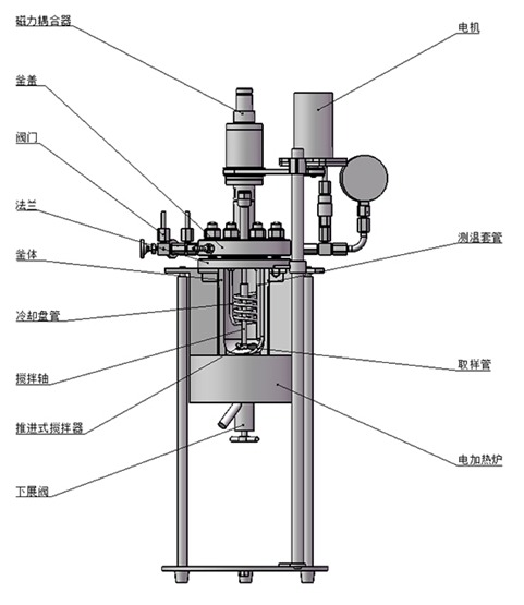 該結(jié)構(gòu)為環(huán)形磁力密封裝置,依靠兩組強力磁鋼異極相吸的原理通過磁場穿透密封罩體來實現(xiàn)力矩的無接觸式傳遞,由于電機經(jīng)過皮帶二級減速,故而其攪拌特點是大轉(zhuǎn)矩低轉(zhuǎn)速(≤750r/min),適合攪拌中高粘度(cp≥5000mpa.s)或固體顆粒含量較多的反應(yīng)物料介質(zhì)體系。